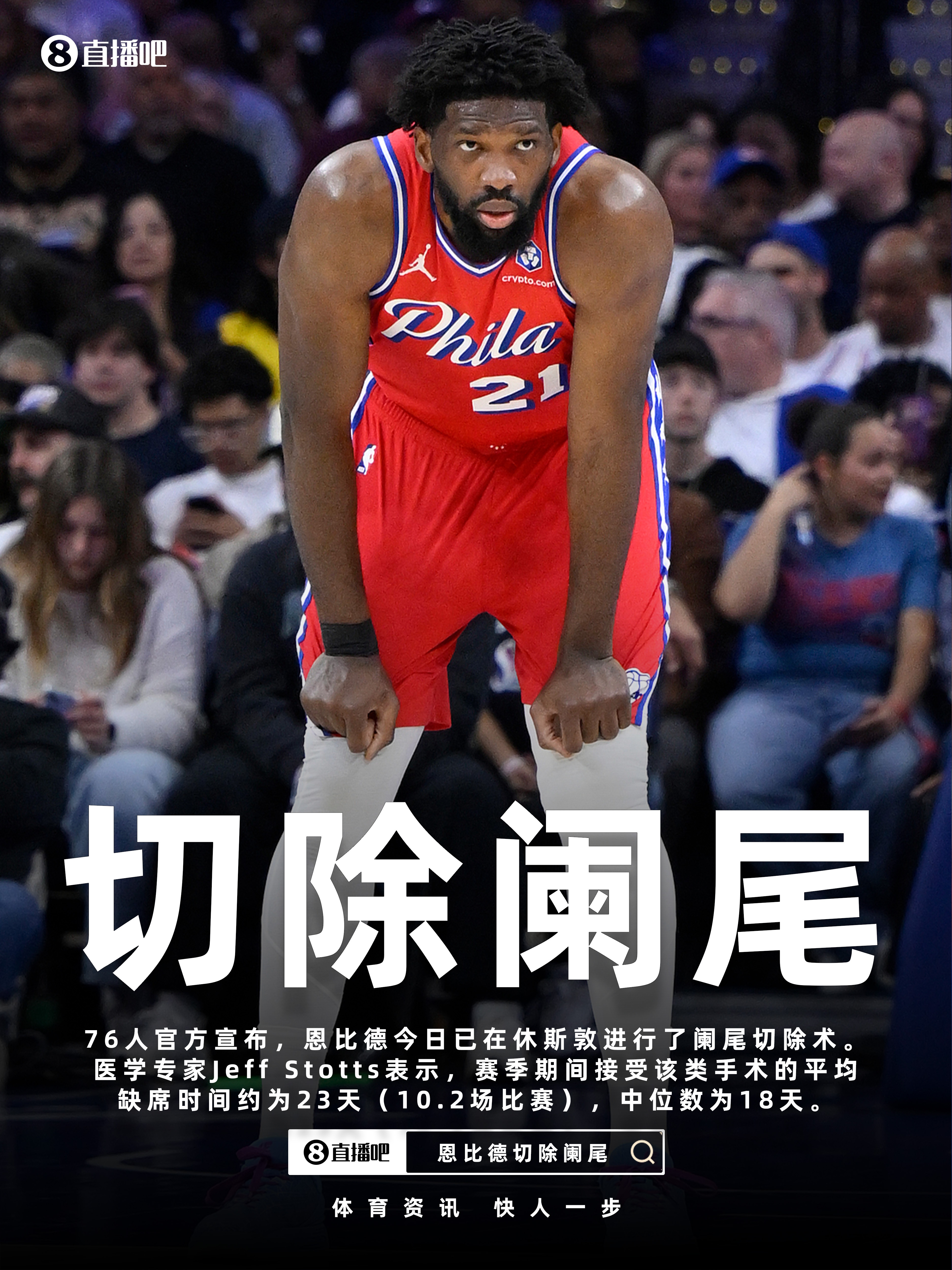 76人官方尚未透露恩比德具体缺阵时间,不过医学专家Jeff Stotts表示:“恩比德医疗更新:阑尾切除术在NBA中相对少见,但像格兰特·希尔和阿努诺比等球员都曾接受过该手术。赛季期间接受手术的平均缺席时间约为23天(10.2场比赛),中位数为18天。”